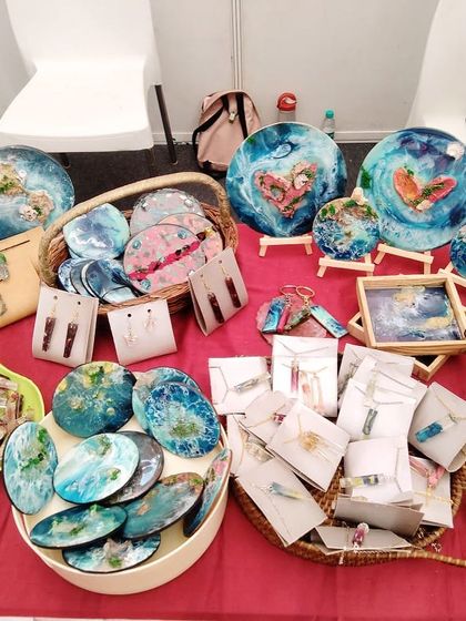 Beyond large walls, I also create smaller, personal pieces of art. This includes my collection of handmade resin art, jewelry, and other crafts, many of which are made from repurposed and waste materials. You can find these unique, handcrafted items at my pop up stalls at various events and melas.