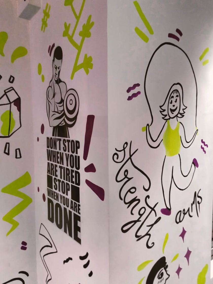 I create motivational doodle and graffiti murals designed to keep the vibe buzzing in high-energy spaces. Perfect for gyms, fitness studios, and hostels, my art mixes powerful words and fun icons to inspire action and grit.