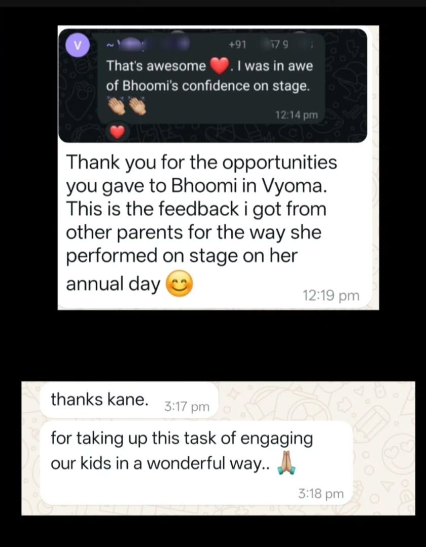 Vyoma is more than just a space; it's a community. We are fueled by the energy of our students, the applause of our audiences, and the heartwarming feedback from our patrons. This collection is a tribute to the people who make Vyoma a warm, encouraging, and vibrant hub for the arts.