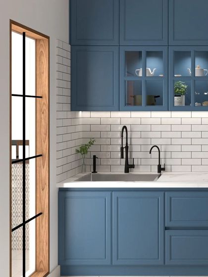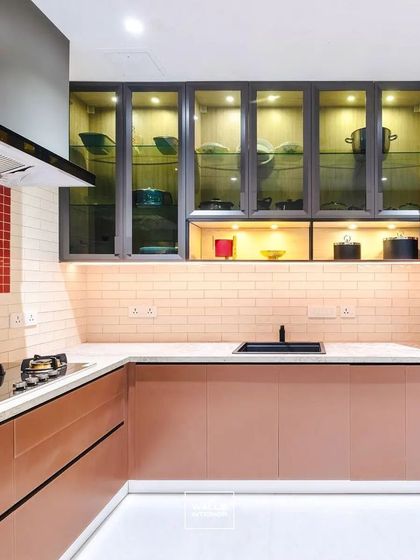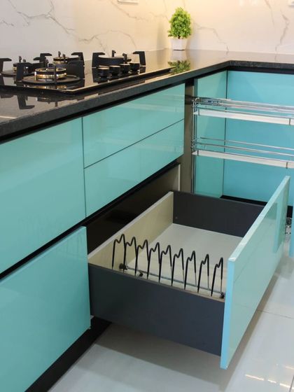 - Cabinet finishes from high-gloss modular kitchen cabinets to matte, textured, and wood-look styles