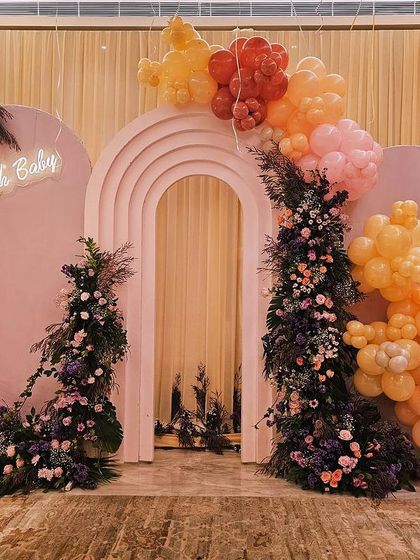 - Balloons: Dense organic garland (400-500 balloons) with theme-specific foil balloons.