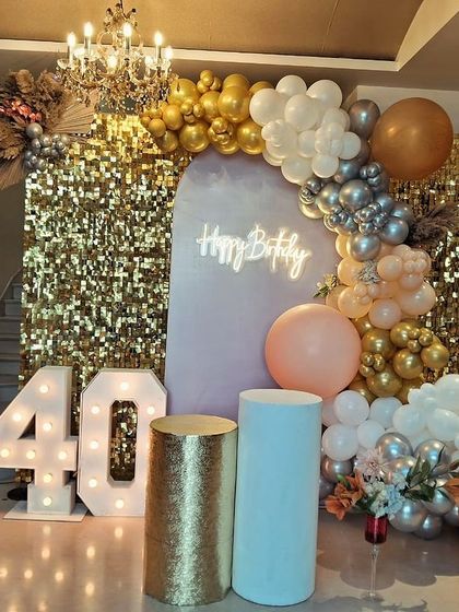 - Balloons: Asymmetrical garland running up one side using Premium Chrome/Metallic balloons.