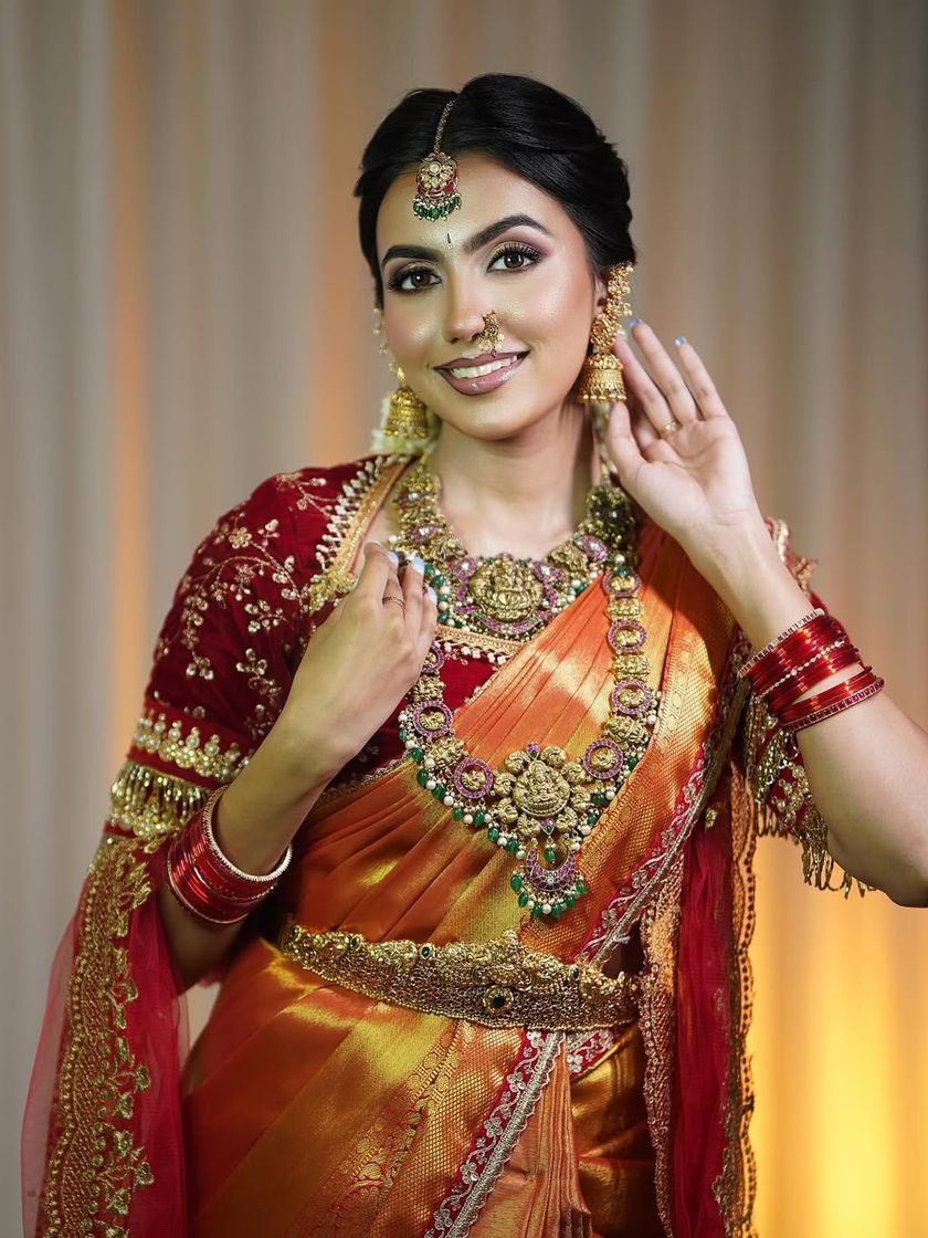 For brides who love a pop of color, I offer a beautiful range of jewellery featuring green, red, and pink stones. These sets often combine traditional designs with vibrant beads and gems, perfect for coordinating with colorful silk sarees for a Pellikuthuru or Muhurtham.