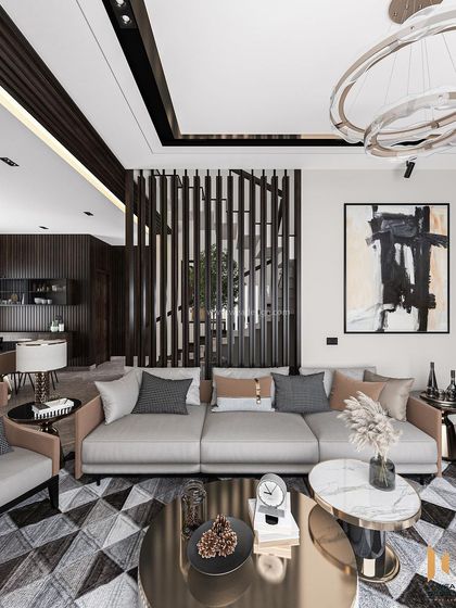 - Open living spaces, fluted glass partitions, solid wood dining tables