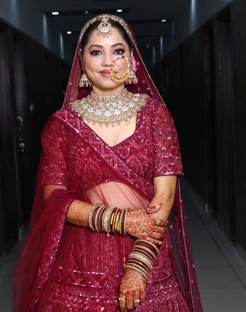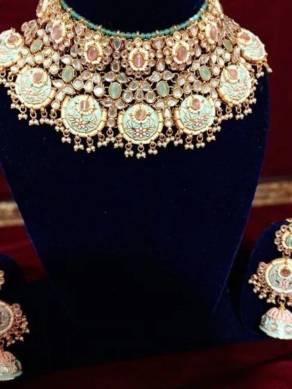 For the modern bride, I offer a collection of jewellery in contemporary designs and soft pastel colors. This includes sets with colorful meenakari work and pieces in shades of pink, mint green, and lavender to perfectly match non-traditional lehengas.