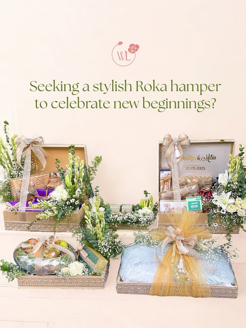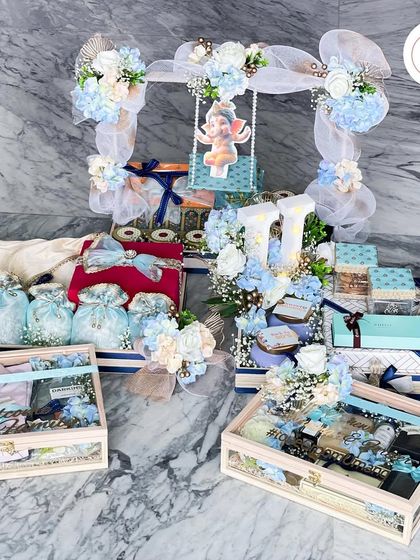 I design and create everything needed to make your engagement or roka ceremony unforgettable. This includes custom ring platters with personalized initials and florals, as well as complete trousseau setups with hampers for the whole family.