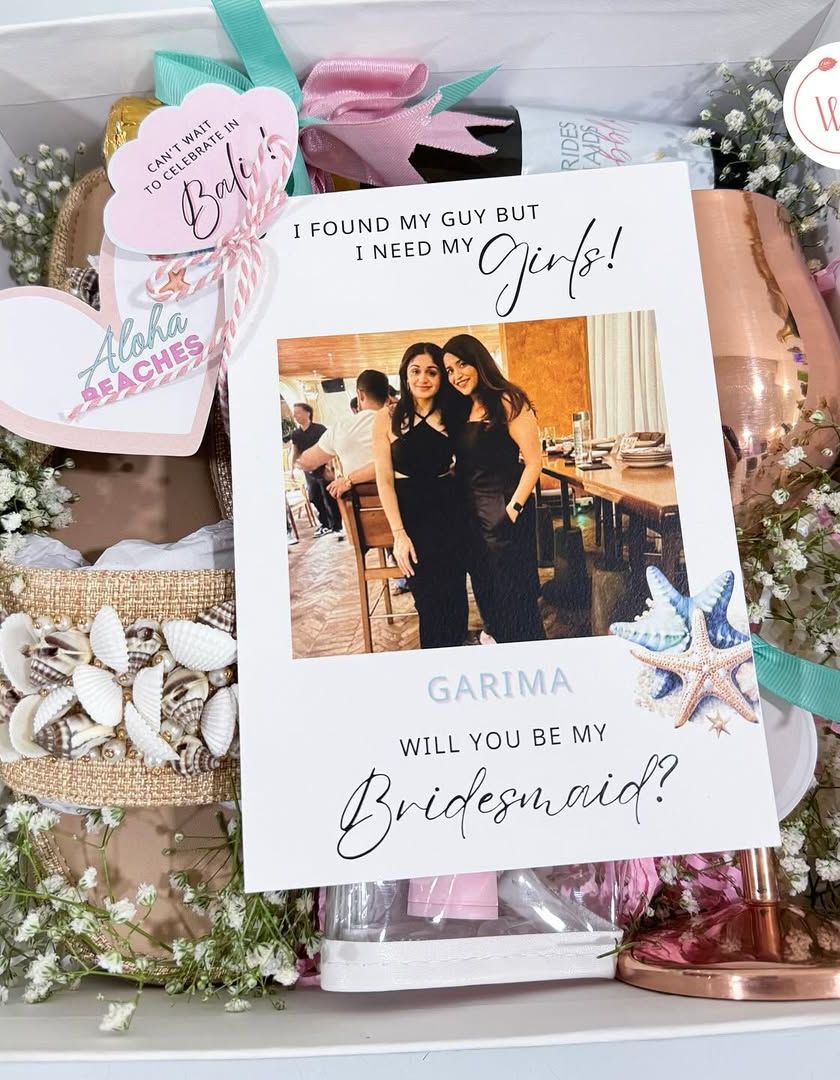 Your A-team deserves the best. I design everything from heartfelt "Will you be my Bridesmaid?" proposal boxes to fun-filled bachelorette hampers with matching apparel, personalized accessories, and party essentials to get the celebration started.