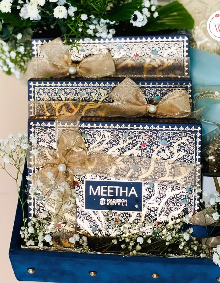 Your wedding story begins with the invitation. I design complete invitation hampers that include the card, gourmet treats, and thoughtful gifts, all presented in beautifully crafted boxes or trays. These can be fully customized to match your wedding theme, from floral and romantic to modern and chic.