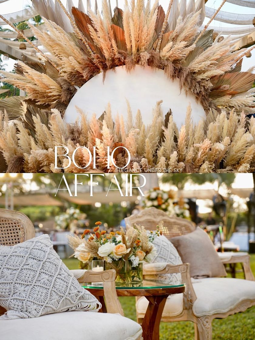For the free-spirited couple, I create earthy and romantic atmospheres using natural textures like pampas grass, rattan, and vintage pieces. These setups are perfect for intimate outdoor events that feel both relaxed and effortlessly chic.