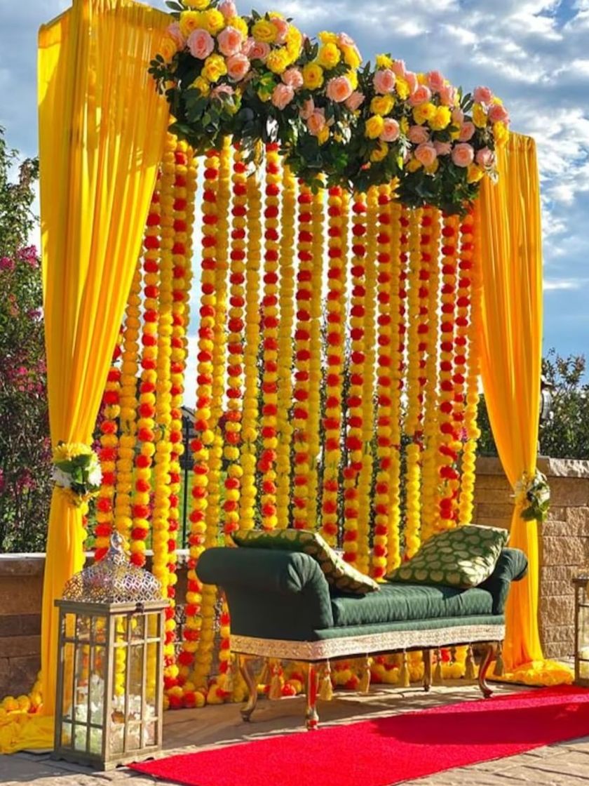 We specialize in creating stunning decor for your Haldi ceremony right at your home. Our designs are centered around traditional elements like marigold flowers, blended with modern seating and elegant backdrops to create a joyful and picture perfect setting for this special pre-wedding ritual.