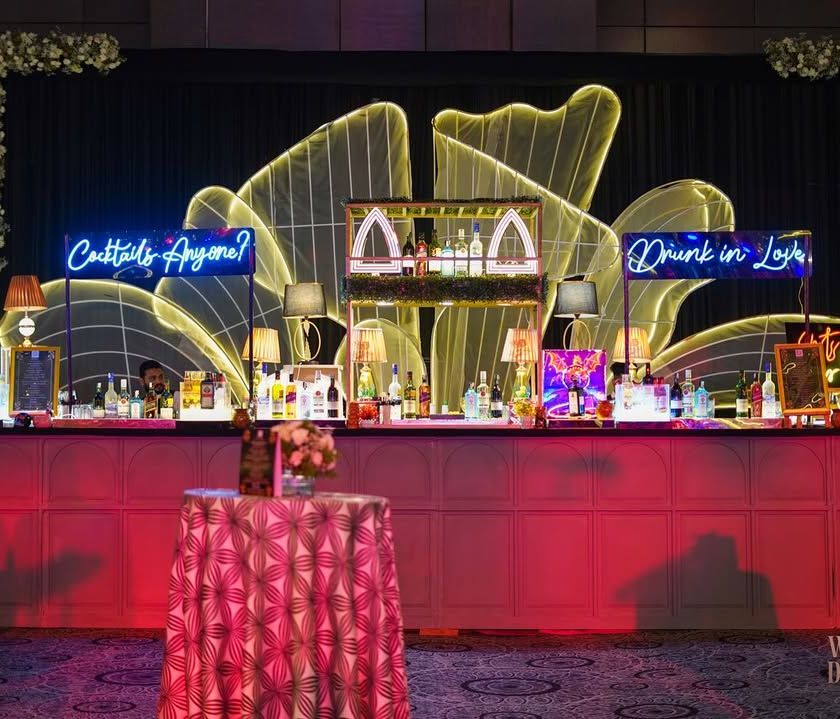 For high-energy celebrations like a Sangeet or cocktail night, I design dynamic, modern spaces. I use elements like neon-lit floral tunnels, butterfly motifs, and dramatic ceiling installations to create a vibrant and unforgettable party atmosphere.