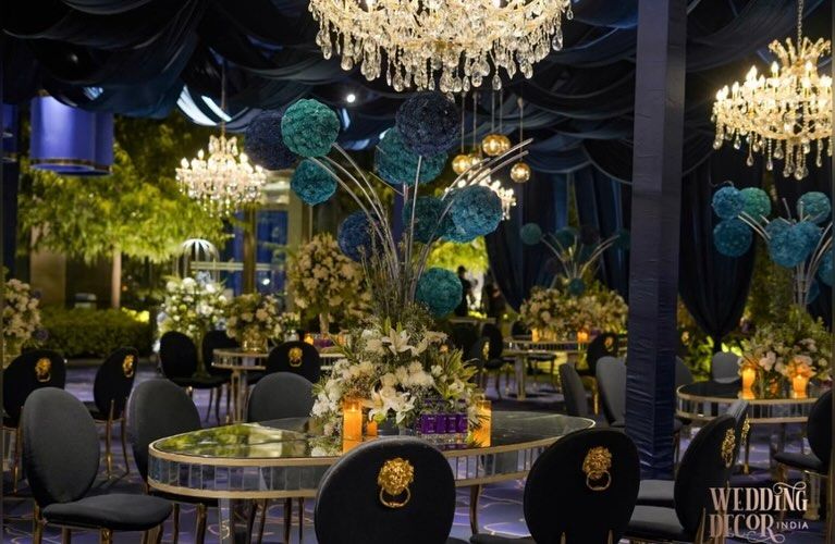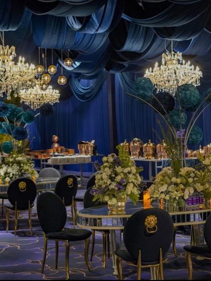 For a truly opulent and modern reception or cocktail night, we designed this spectacular theme around a rich palette of royal blue and silver. The entire venue was draped in deep blue velvet, creating a dramatic canvas. We layered this with magnificent crystal chandeliers, modern lighting, and whimsical motifs like illuminated butterflies to create a high-fashion, unforgettable affair.
