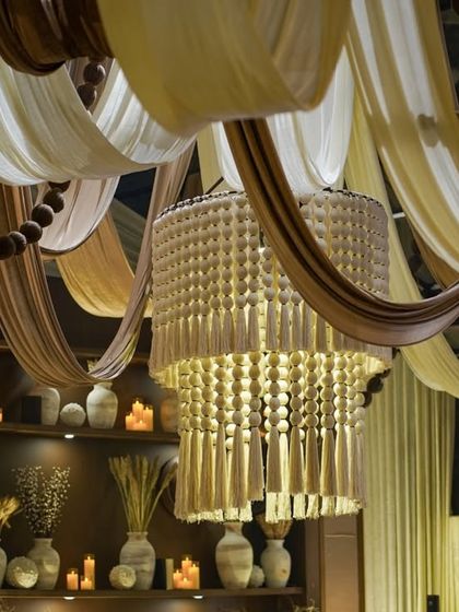 We design sophisticated spaces that feel warm, inviting, and effortlessly chic. This style uses a blend of earthy tones, natural textures, and bohemian-inspired elements. Key features include flowing fabric drapes in shades of beige and brown, arrangements with dried florals and pampas grass, and unique details like pearl accents and tassel chandeliers.