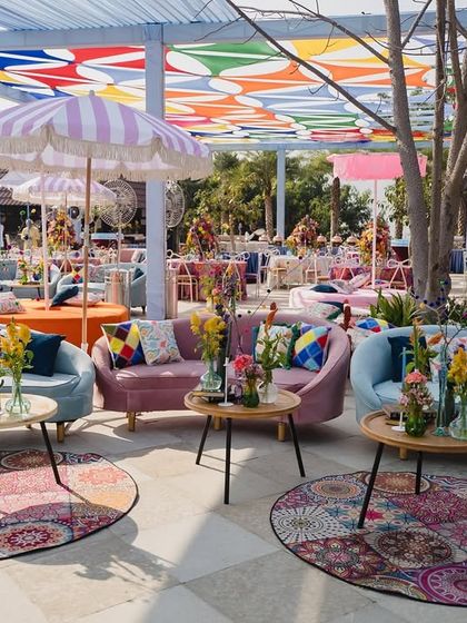 We design daytime events like Haldi and Mehendi to feel like a festival. These setups feature bold color palettes, quirky prints, funky art installations, and playful details to create a high-energy, joyful celebration.