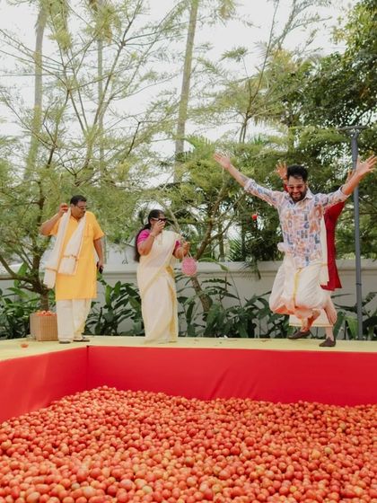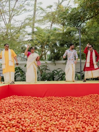 Storytelling Through Design - We create custom wedding installations, like maze-themed haldi or La Tomatina wedding party, that tell your story.