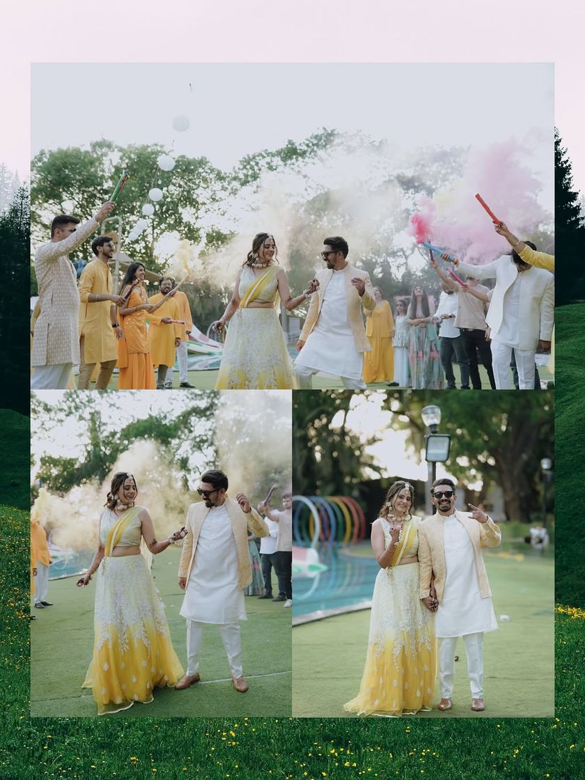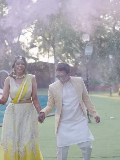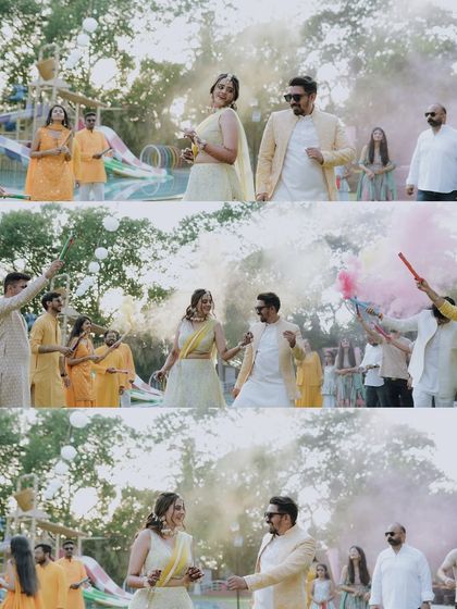 We capture the joyful chaos and brilliant colors of your Haldi and Sangeet ceremonies. Our team focuses on the candid laughter, dancing, and playful moments with your family and friends, sometimes using creative elements like smoke bombs for extra fun.