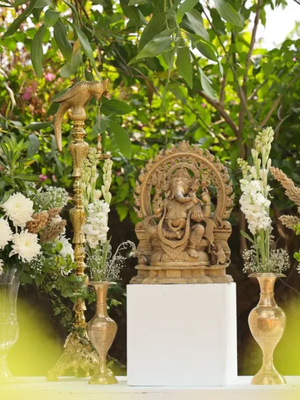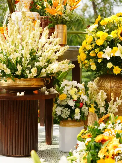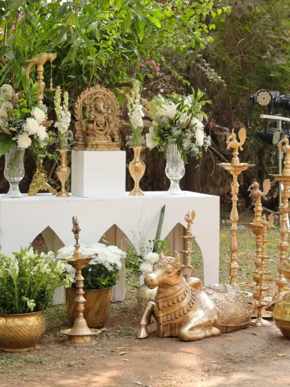 We specialize in creating distinctive decor for different wedding ceremonies like Mehndi, Haldi, and Varmala. Our designs blend vibrant color palettes with traditional elements - from retro-themed Mehndi setups with disco balls to South Indian mandaps adorned with banana leaves and white flowers.