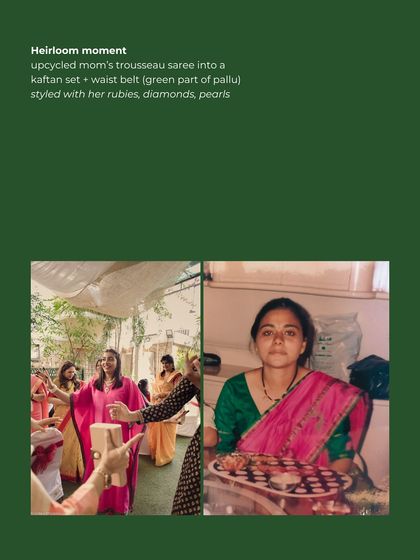 We believe family heirlooms are more than just objects; they are stories. We specialize in reviving and repurposing these treasures, from your mother's wedding saree to your nani's vintage silver, integrating them into your wardrobe in a way that is both sentimental and stylish.