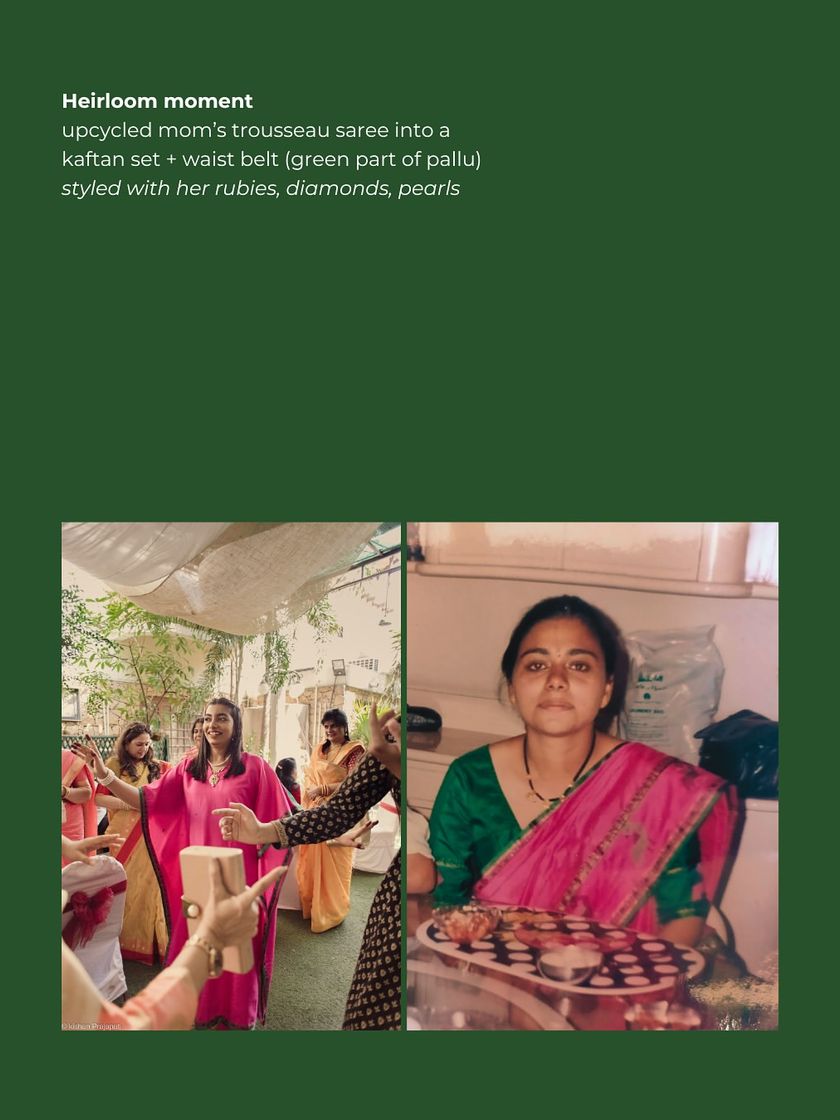 We specialize in breathing new life into your family's treasured textiles. From transforming a mother's wedding Gharchola into a jacket for the father to reviving a grandmother's Kanjeevaram, we help you weave your family's history into your celebration.
