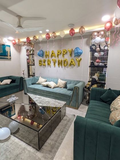 Perfect for surprising a loved one, I can transform any bedroom or living room into a festive and personal space. These setups often include balloons on the ceiling and floor, foil letter banners, and can be personalized with fairy lights and photos.