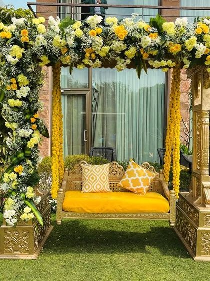 - Haldi ceremony decor is all about yellow vibes - full-on genda phool (marigold) everywhere, outdoor jhoolas, comfy gaddas. The setup’s bright, traditional and looks epic in photos.