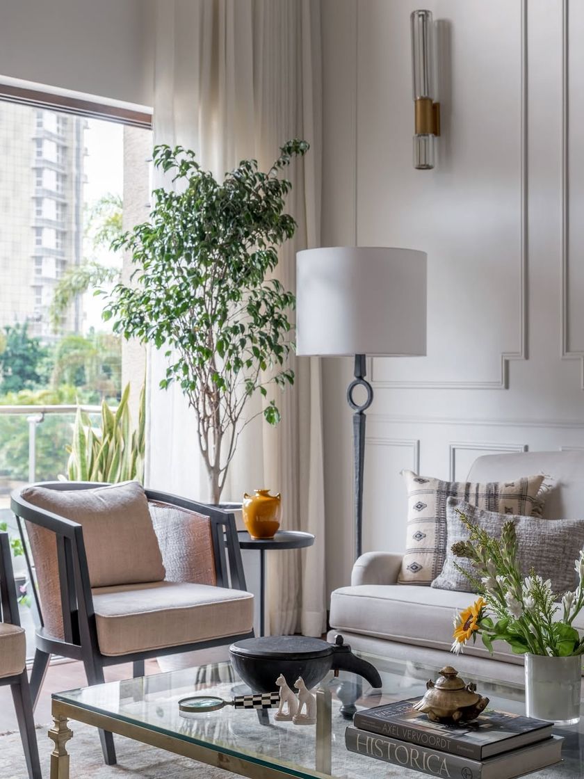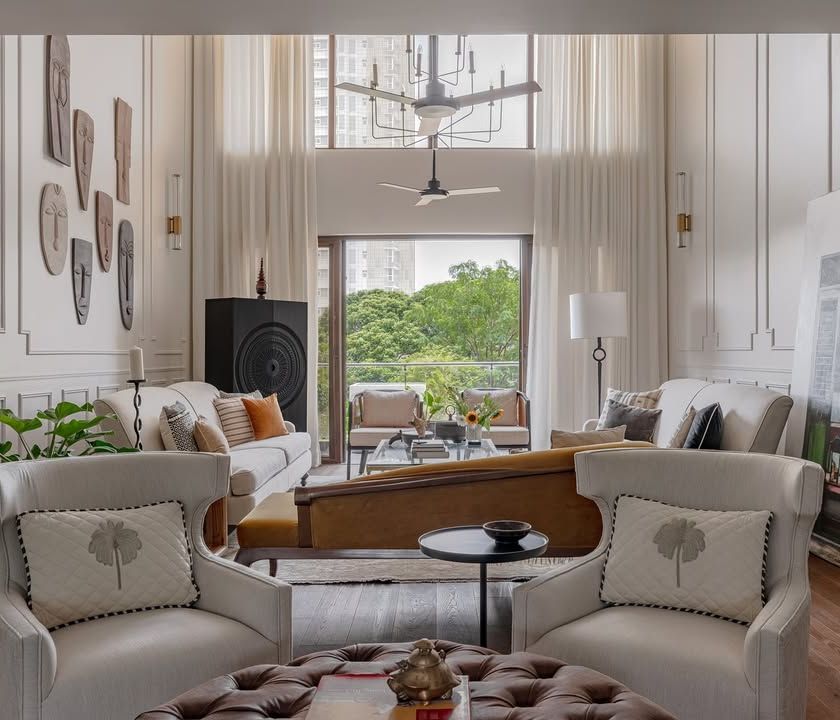 This 4,000 sq ft duplex apartment in Bengaluru was designed to feel like a classic English mansion but with a calm, minimal grace. We created a neutral canvas with creamy whites and soft greys to showcase the family's collection of art and antiques, blending their memories of London and Madras into a timeless, collected home.
