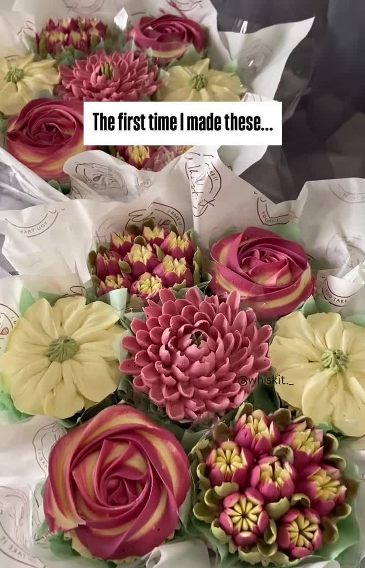 These are my signature "boucakes," and they are my whole heart. I hand-pipe intricate buttercream flowers like roses, sunflowers, and peonies onto fresh cupcakes and arrange them into a stunning bouquet that is 100% edible. They are available in various color palettes and sizes, from small handheld bouquets to large centerpiece baskets.