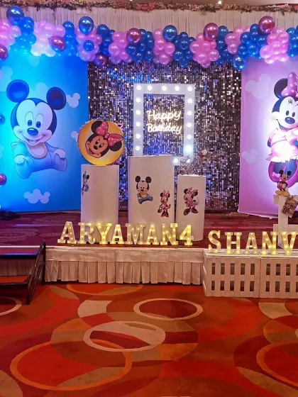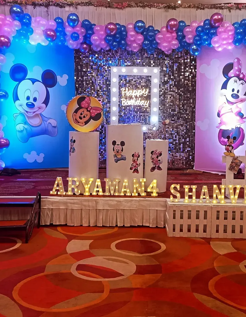 We specialize in creating magical birthday parties for children with fully customized themes. From popular cartoons like Mickey Mouse to princess or jungle themes, we handle everything from the entrance arch and stage backdrop to personalized details like light-up names.