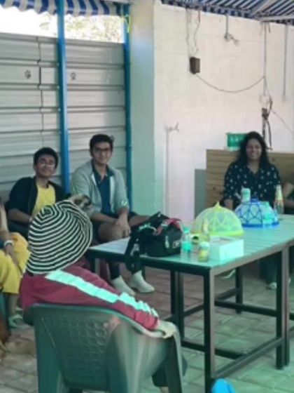 - Human Seating: Standard plastic chairs and tables located under a shaded roof (non-AC).