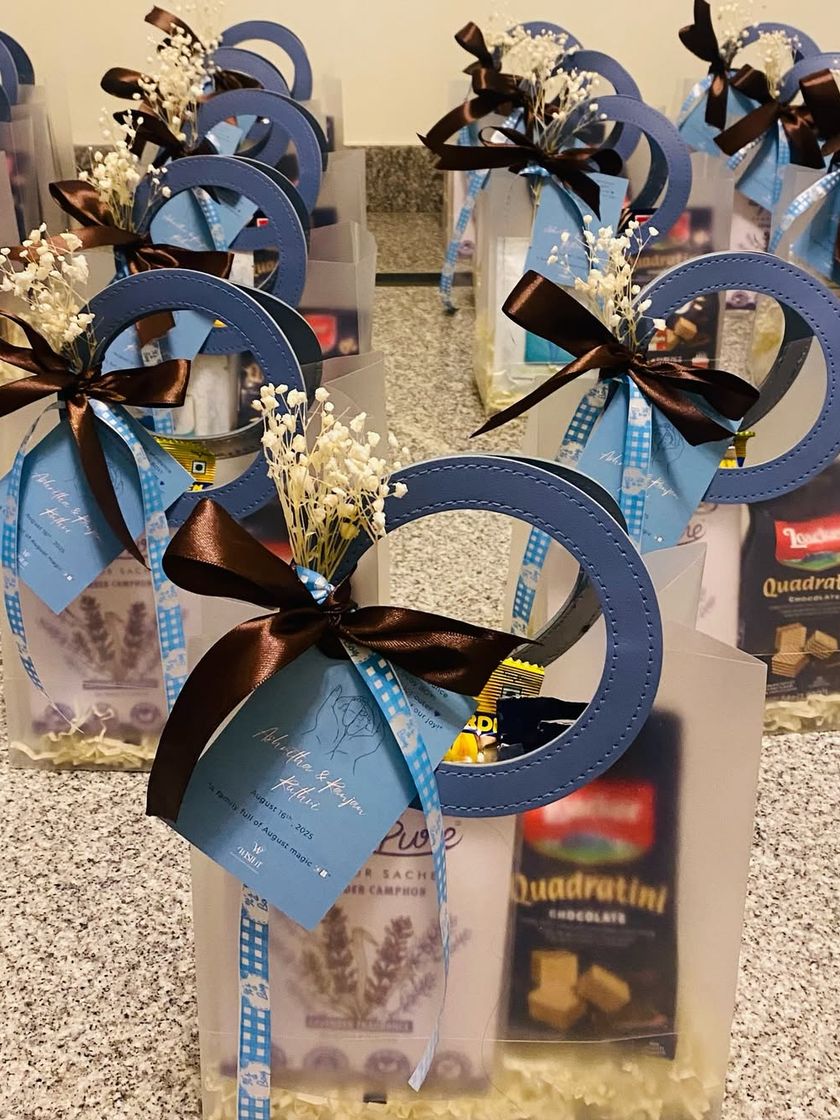 From modern thamboolam bags that blend tradition with style to fun hangover kits for your bride tribe, I create memorable keepsakes for your special day. I offer full customization on packaging and contents to match your wedding theme perfectly.