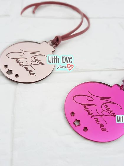 We create personalized Christmas ornaments and decorations using premium acrylic materials with mirror finishes. Our collection includes customizable baubles, stockings, and ornaments featuring names, dates, and festive motifs in various shapes like snowflakes and stars.