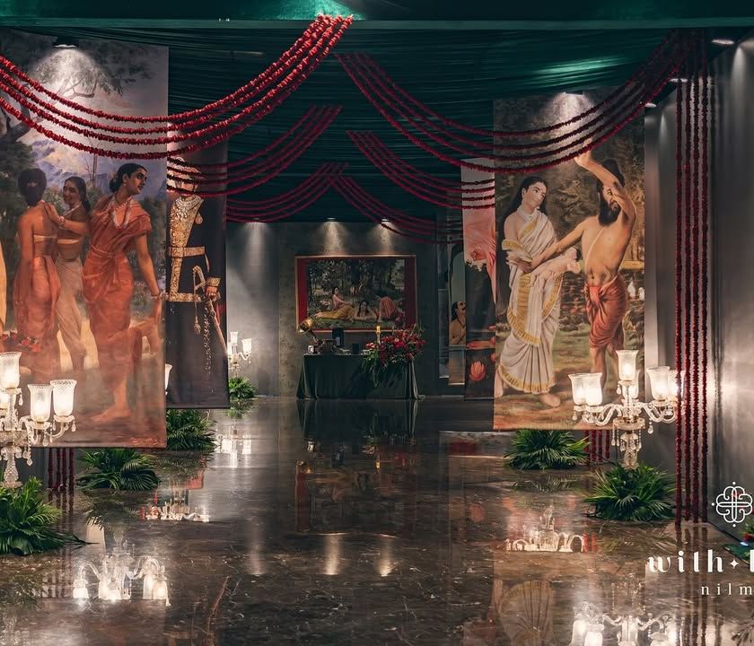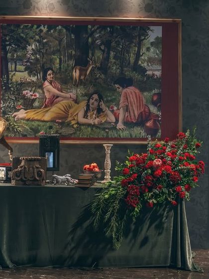 For clients who are art lovers, we design events that are living paintings. This collection showcases a sangeet inspired by the iconic Indian artist Raja Ravi Varma, using his dramatic interplay of light and shadow, rich color palettes, and love for opulent textiles to create a deeply atmospheric and soulful experience.