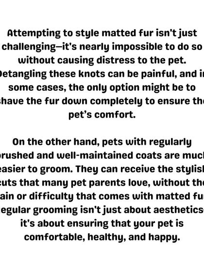 Regular grooming is about more than just looks; it's essential for your pet's health, preventing painful mats and skin infections. I can help you establish a proper brushing routine and identify skin issues early.