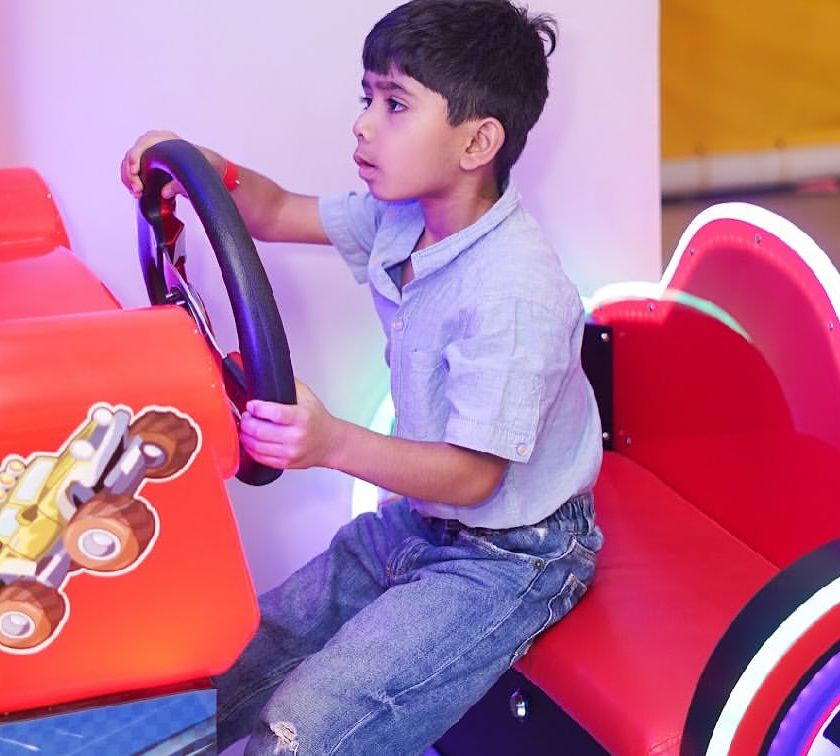 Beyond the main play structures, we have a variety of other fun zones. Kids can enjoy arcade racing games, air hockey, or let their imaginations run wild in our pretend-play sets like the dollhouse and supermarket.