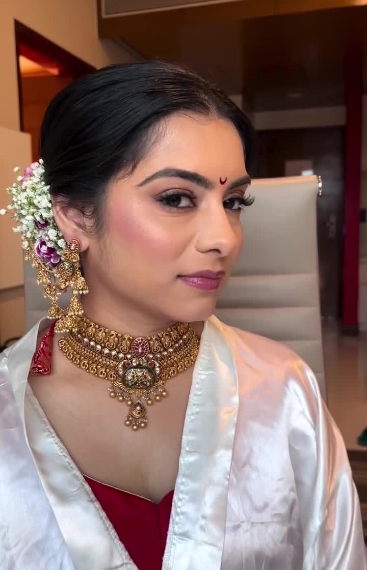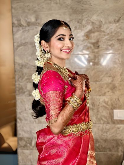 I have extensive experience with South Indian bridal traditions. I create stunning looks that pair perfectly with Kanjivaram sarees, featuring classic temple jewelry, intricate braids, and fresh flower arrangements like jasmine venis.