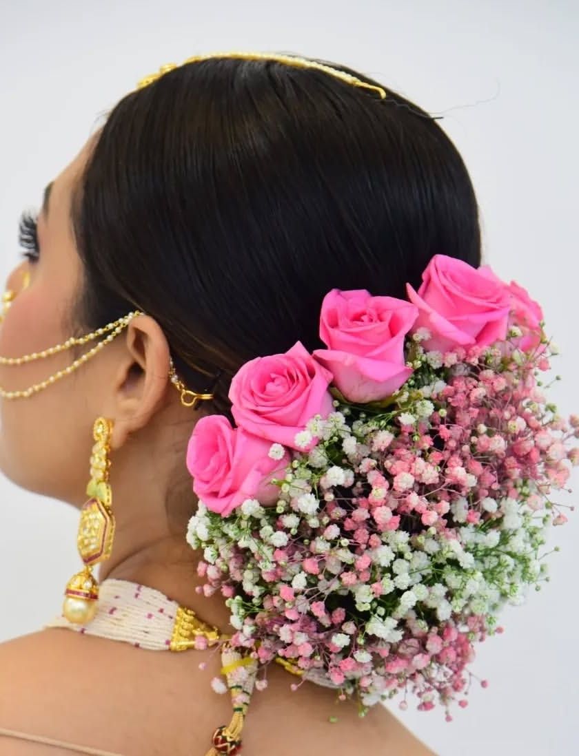 My floral buns are one of my most requested styles. I create a range of updos, from intricate traditional buns to soft, messy styles, always using fresh flowers like roses, baby's breath, or custom arrangements to complete the look.