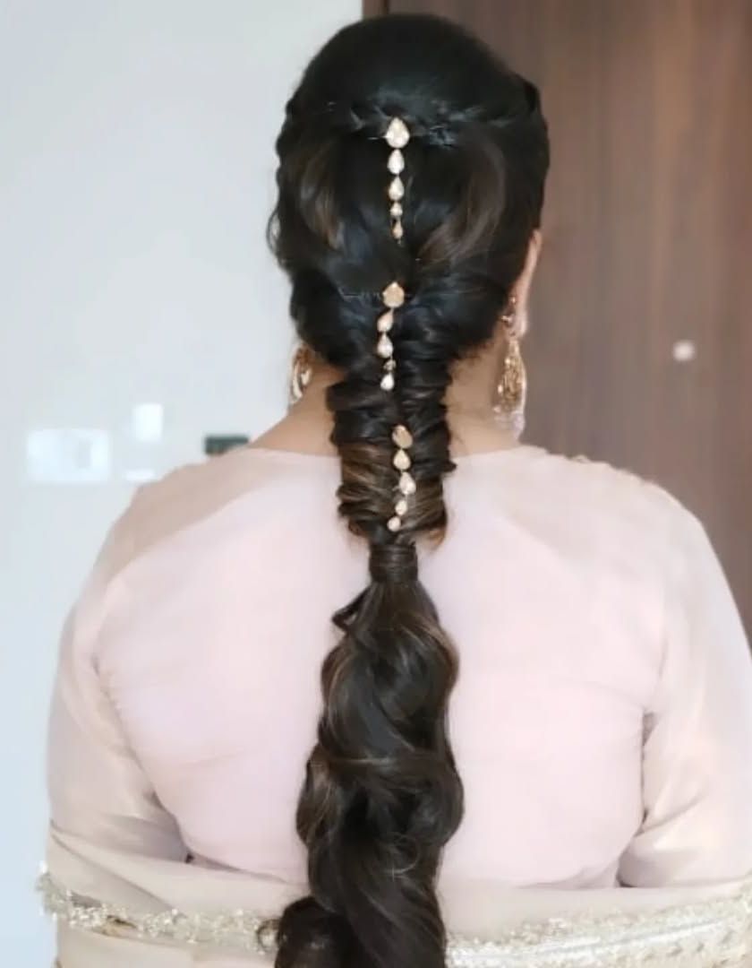For a modern and stylish alternative to traditional updos, I design a variety of chic hairstyles. This includes everything from intricate, decorated braids to sleek and voluminous ponytails perfect for a Sangeet or cocktail event.