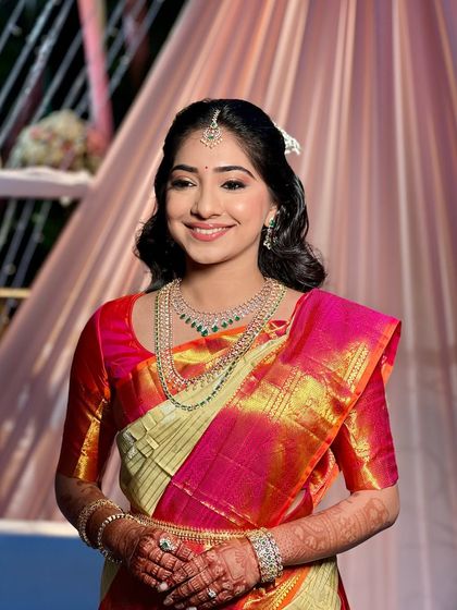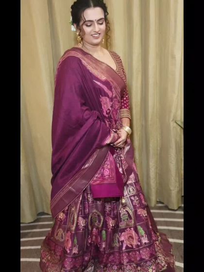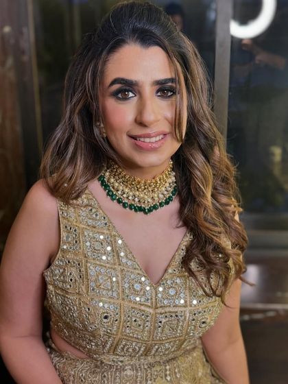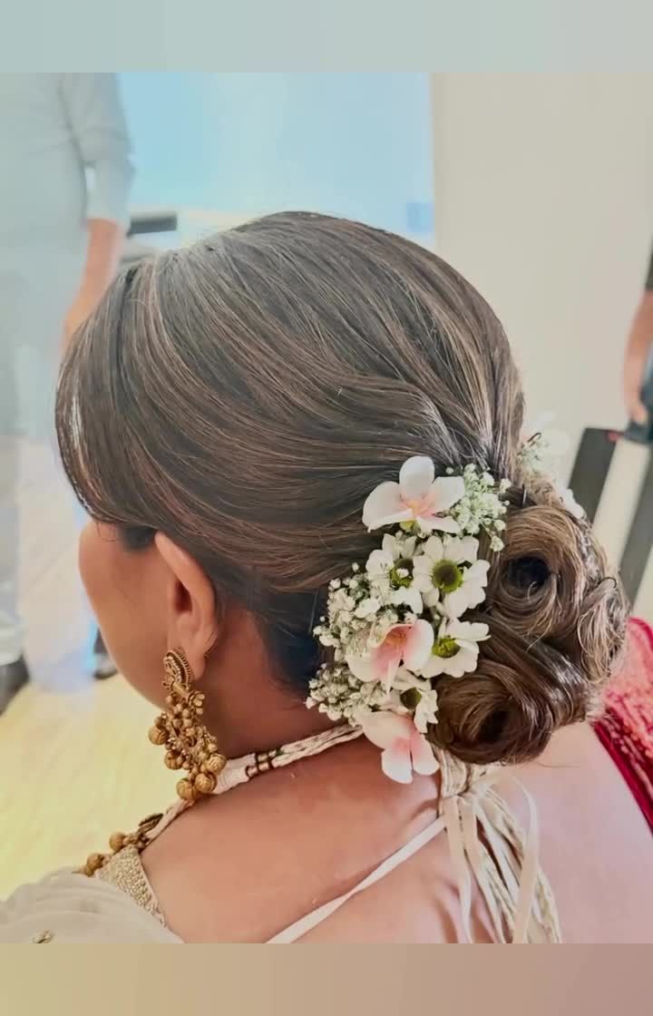 I design a variety of updos, from classic, sleek chignons to modern, messy buns. A popular choice for traditional events like weddings and sangeets is a floral bun, which I create using fresh flowers like roses, baby's breath, or traditional gajra to match your outfit. These styles are perfect for keeping your hair securely in place while looking effortlessly elegant.