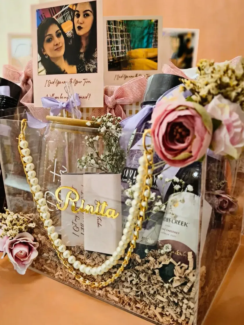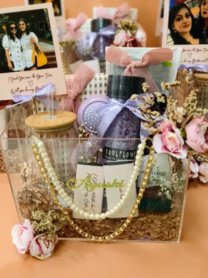 Show your appreciation to the people who stand by you on your special day. I design thoughtful and personalized gifts for your entire wedding party and guests. From curated acrylic hampers for your bridesmaids to practical welcome baskets for out-of-town guests and unique return favors, I help you give gifts that are both beautiful and meaningful.