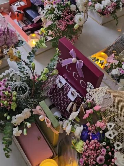 For Diwali, I go all out with festive Diwali gift wrapping using urlis, banarasi boxes, and fairy-lit acrylic boxes. Holi hampers are bright and playful. Birthdays and milestones get grand arrangements with flowers, dessert platters, and unique birthday gift presentation.