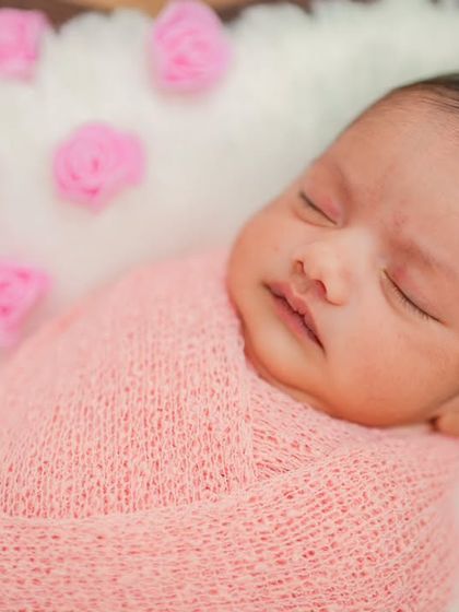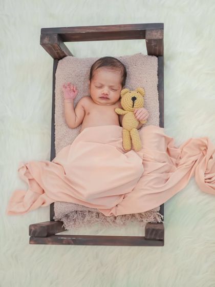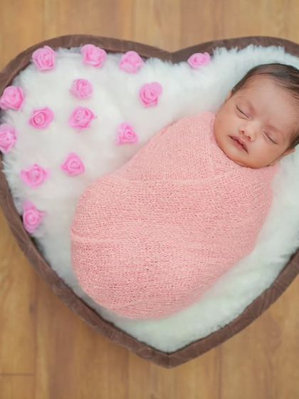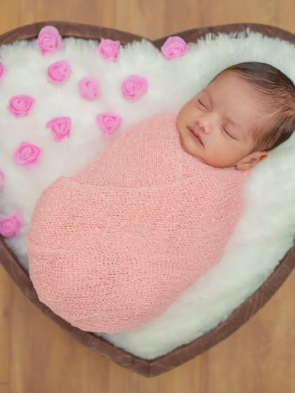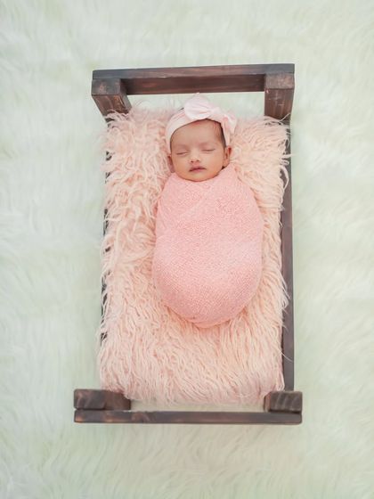 - For a posed newborn session, I gently swaddle your baby, use soft wraps, knit textures, and simple props - think tiny beds and heart-shaped baskets.
