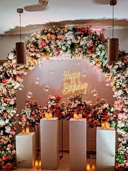 - Glam and shimmer walls, neon sign party backdrop ideas, and lots of flowers for that extra touch