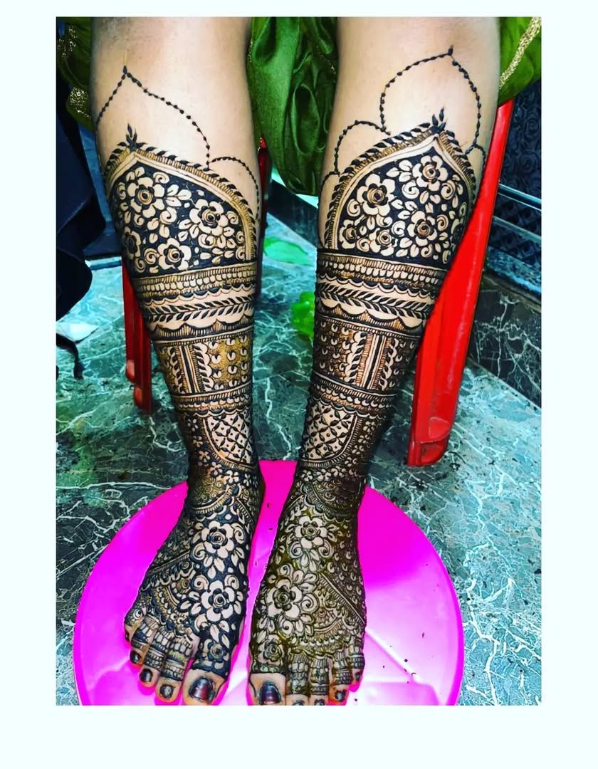 Complete your bridal look with beautiful mehendi on your feet. I offer everything from simple, elegant patterns that adorn the top of the feet to full-coverage designs that extend up to the ankles or calves, matching the style of your hands.