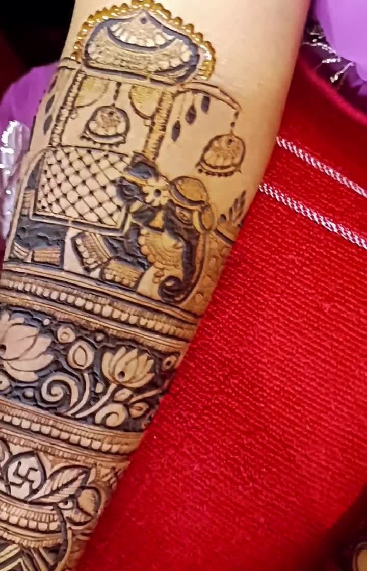 For brides who want their mehendi to tell a story, I create designs with classic Indian wedding motifs. I can incorporate elements like bride and groom figures, a wedding doli, peacocks, elephants, and lotus flowers to make your bridal henna deeply personal and symbolic.