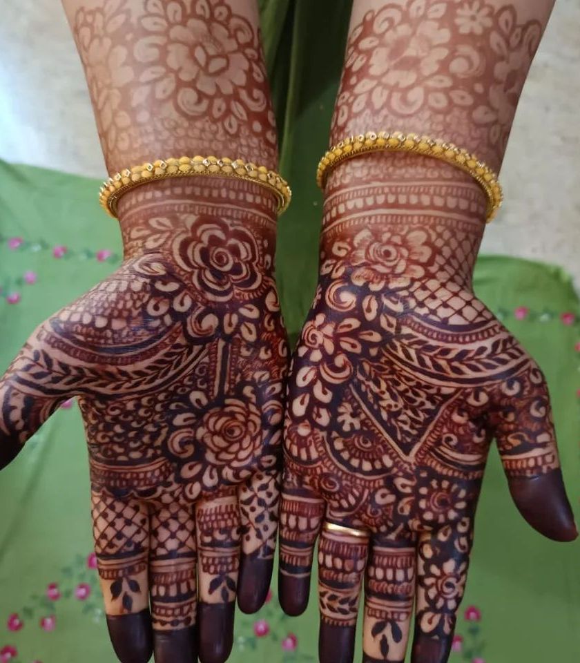 The final color is everything. I use only my own homemade organic mehendi paste, which guarantees a deep, dark, and long-lasting stain without any harmful chemicals.