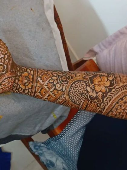 I specialize in creating custom mehendi designs for grooms, blending traditional and contemporary styles. My designs incorporate Indo-Arabic patterns, geometric shapes, and personalized elements like initials or significant symbols.