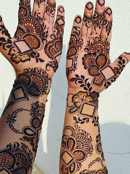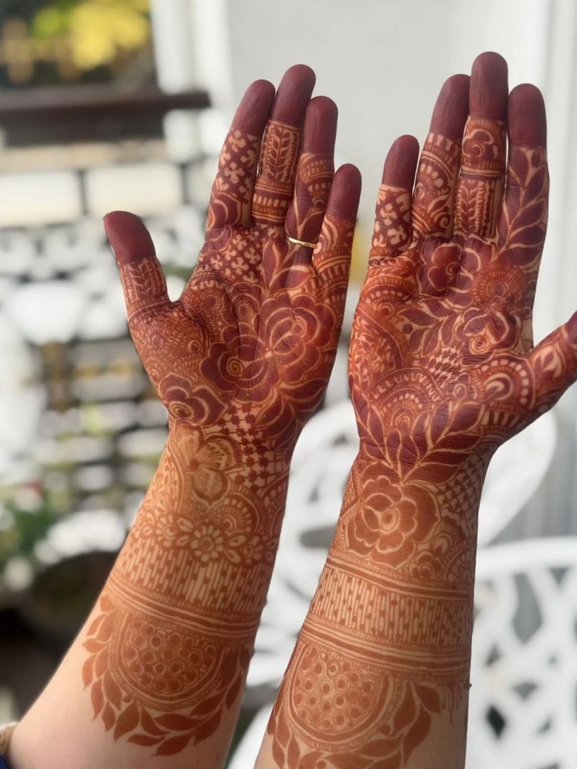 For the bride, mehendi is more than just a design, it's a story. I specialize in creating detailed and personalized bridal mehendi that covers the hands and feet, featuring everything from traditional motifs like peacocks and elephants to portraits and floral patterns. My work ensures you will have stunning, dark-stained henna for your wedding photos.