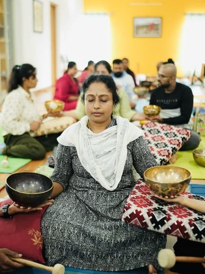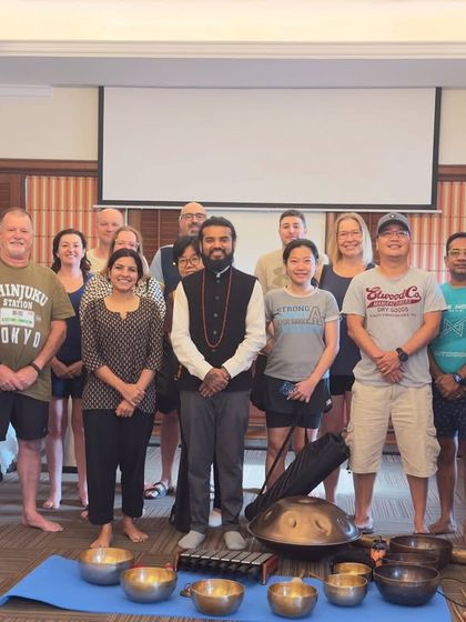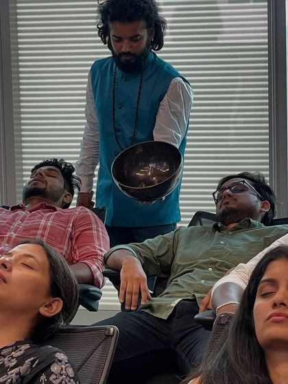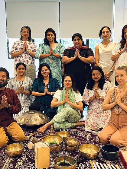 I run workshops where you practice yoga, experience sound healing with over 45 instruments, and learn Indian wellness techniques like Marma therapy and chakra balancing, in formats that fit busy schedules, retreats, or corporate teams.