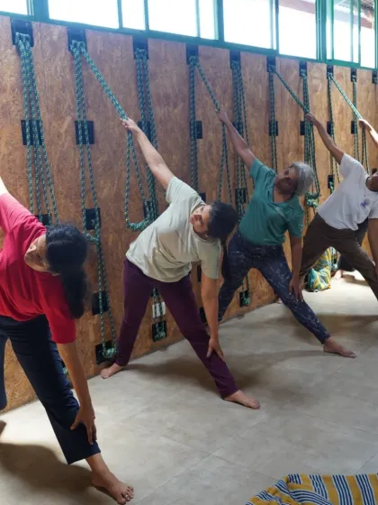 Classes, Therapy, Teacher Training, and Workshops - Group classes, Yoga Therapy, Teacher Training, Corporate Yoga, and unique sessions like Prasanna Vadanam workshop and Yoga Kurunta ropes class.
