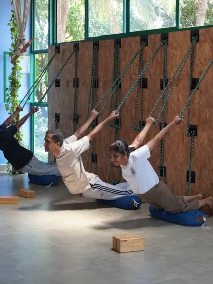 We are obsessed with alignment because it is the key to safety and unlocking the real benefits of yoga. We use a variety of props including belts, blocks, chairs, and a Yoga Kurunta (rope wall) to make poses accessible and deepen your experience.